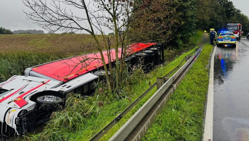 Ostróda #DK15 #StaraSiódemka #Kolizja #Dachowanie #Ciężarówka #ŚliskaDroga #NogaZGazu #PolicjaOstrzega #Bezpieczeństwo