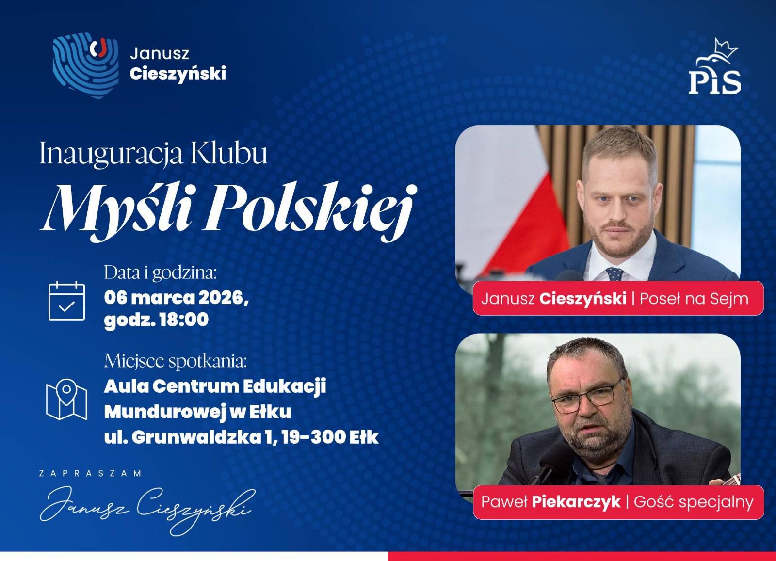 Poseł Janusz Cieszyński aktywnie włącza się w budowanie przestrzeni dla patriotycznej i nieocenzurowanej debaty w regionie Warmii i Mazur. Teraz zaprasza na inaugurację Klubu Myśli Polskiej w Ełku, która odbędzie się już 6 marca 2026 roku (piątek) o godzinie 18:00.